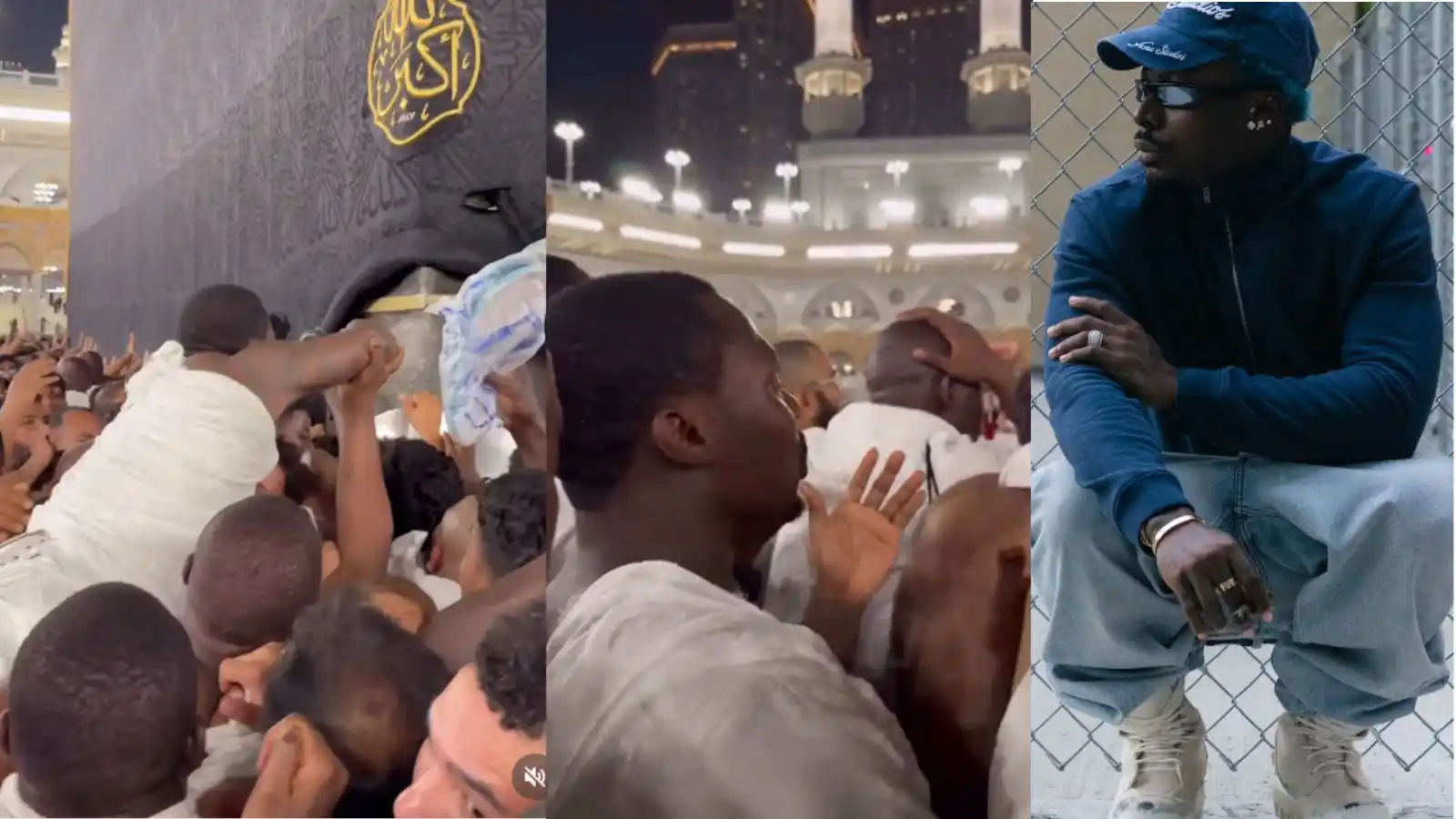 In the video making rounds online, the singer, whose real name is Ololade Ahmed, was lifted by people around him in an attempt to get close to the sacred stone fixed in the Kaaba.