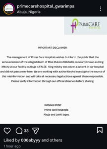 “The management of Prime Care Hospitals wishes to inform the public that the announcement of the alleged death of Miss Mukoro Mitchelle, popularly known as King Mitchy, at our Abuja facility is FALSE. King Mitchy was never a patient in our hospital and did not pass away here. We are working with authorities to investigate the source of this misinformation and will take all necessary legal actions against those responsible. Please verify information through our official channels before sharing,” the statement read.