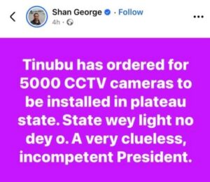 Reacting on Facebook, Shan George wrote, “Tinubu has ordered for 5000 CCTV cameras to be installed in plateau state (sic). State wey light no dey o. A very clueless, incompetent President.”