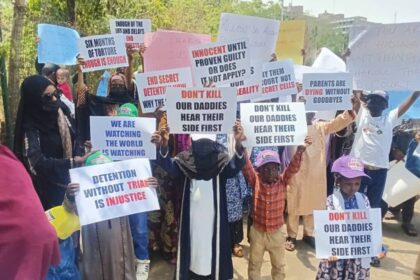 Scores of children and wives of military officers detained over an alleged coup plot staged a peaceful protest at the National Assembly on Wednesday, demanding a quick trial and the release of the arr...